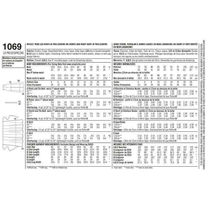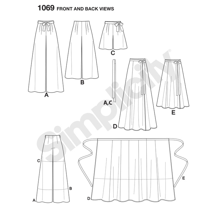 1069 Misses' Wide-Leg Pants or Shorts & Skirts in 2 Lengths. Size: 30-46