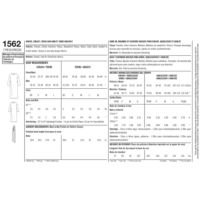 1562 Child's, Teens' and Adults' Robe and Belt. Size: XS-L / XS-XL