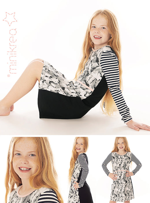 Super simple knit slight A-line dress with sleeve and neckline ribbing, long sleeves and a front waist seam.