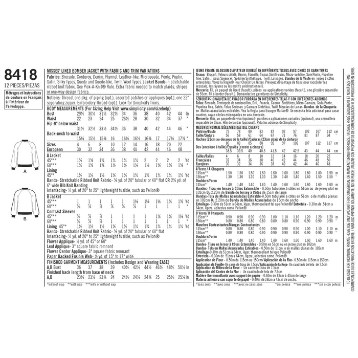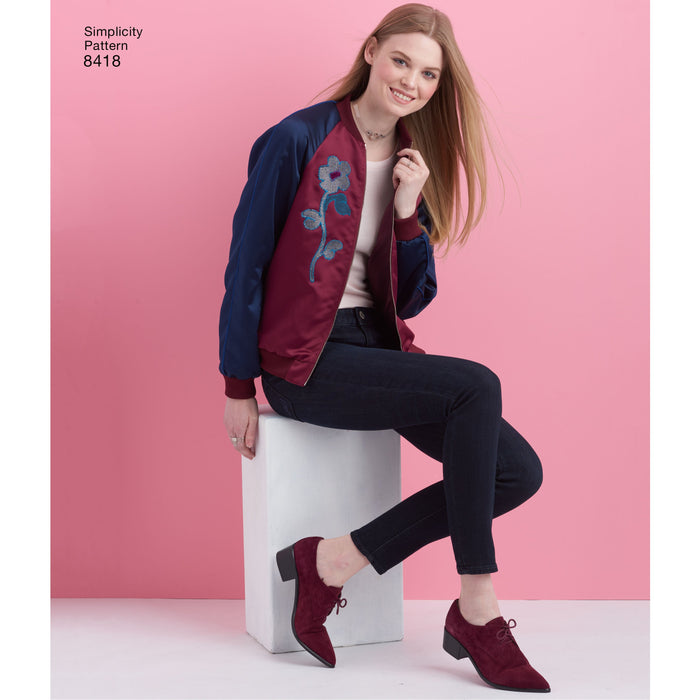8418 Misses' Lined Bomber Jacket with Fabric and Trim Variations. Size: 30-48
