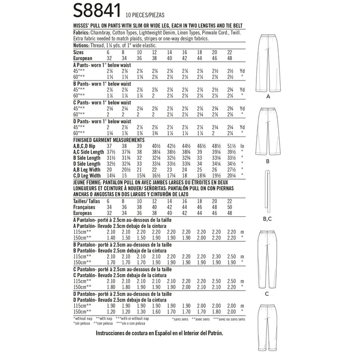 S8841 Misses' Wide or Slim-Leg Pull-On Pants. Size: 32-48