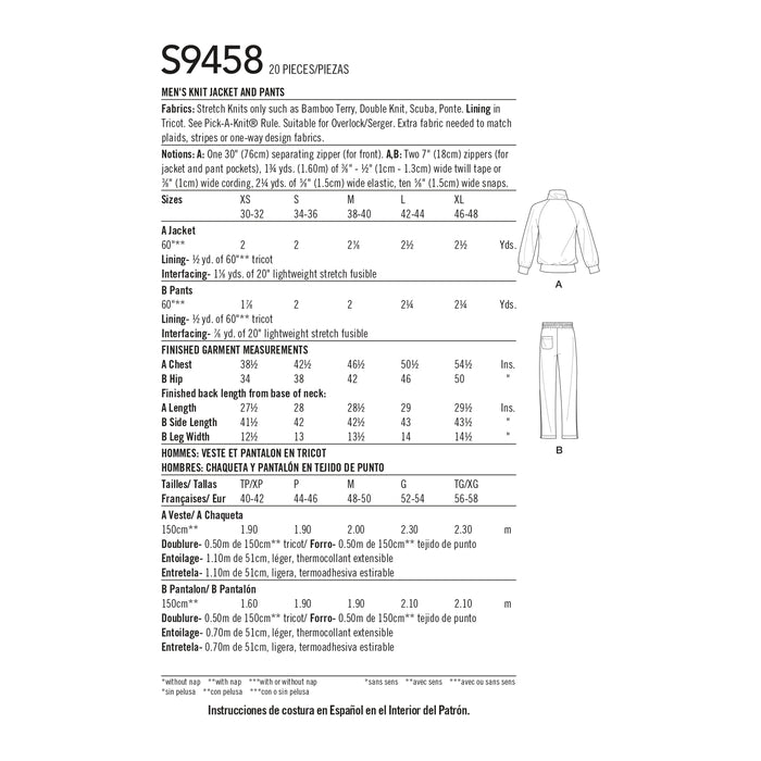 S9458 Men's Knit Jacket and Pants. Size: XS-XL (30-48)