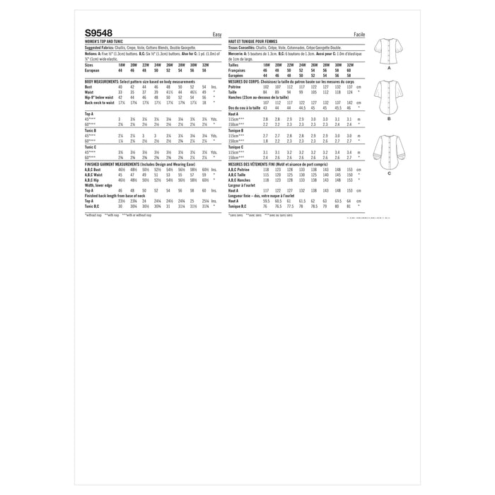 Top and tunic have gathers at front neck and sleeve caps. Back closure has buttons all the way down the back. Blouse has sleeve and hem variations.