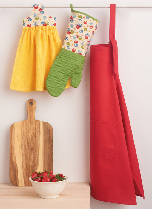 Knife roll, hanging towel, and gauntlet length oven mitt have contrast fabric accents. Utility apron with adjustable neck strap fits most adult sizes. Hanging utensil and pot lid holders have contrast pockets and wooden dowel supports. Hanging bag dryer uses chopsticks, just right for plastic produce bags. See envelope for more information.