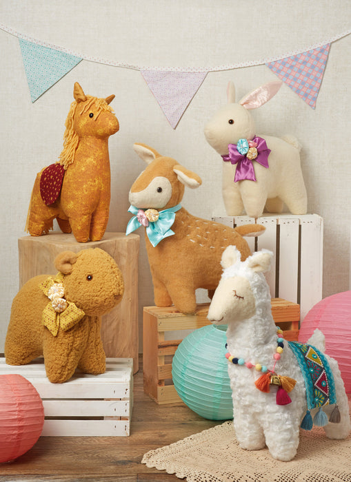 Adorable plush bunny, bear, pony, deer and alpaca stand 10" (26cm) to 14" (36cm) tall. Bunny has yarn pom pom tail, bear and deer have safety eyes and contrast fabric bows embellished with plush yoyo flowers. Pony features yarn tail and mane, safety eyes and contrast saddle. Alpaca has embroidered eyes, trimmed blanket, tassel and pom pom accents. See envelope for more information.