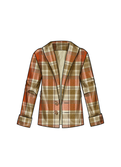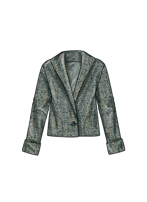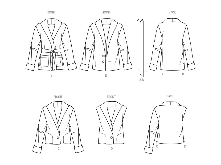 Easy-to-Sew jacket and vest feature shawl collar, front button closure, and pockets. All jackets and vest have front and back lining. Views C and D are cropped.
