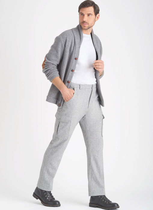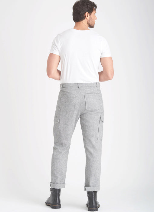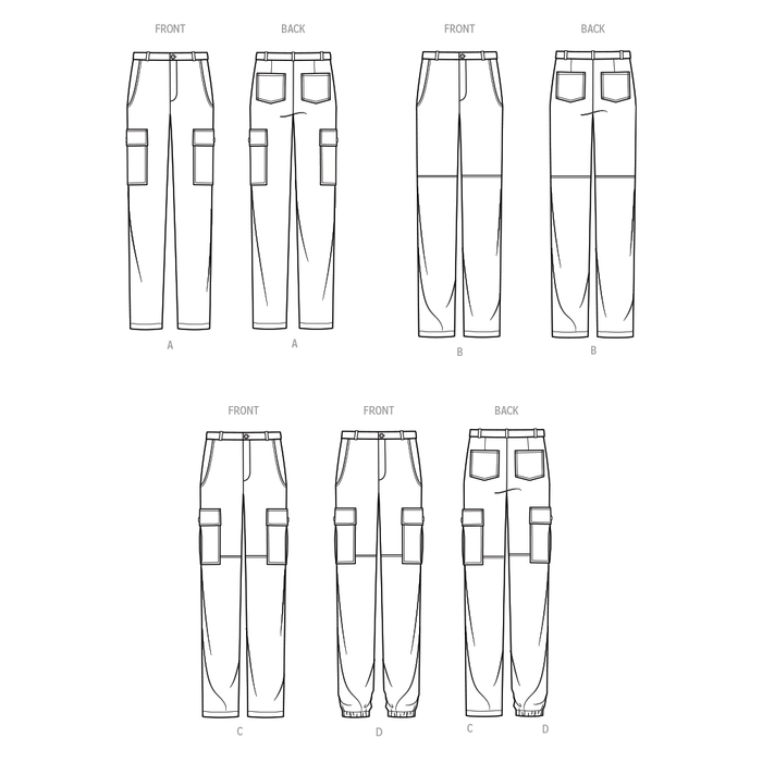 Versatile cargo pants include front slash pockets, back patch pockets, belt carriers and button closure with zip fly. Views A, C and D have cargo pockets on both sides of pants. View A pants are slim fit. View D has elastic hem at ankles.