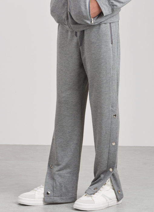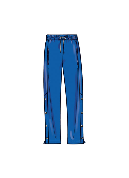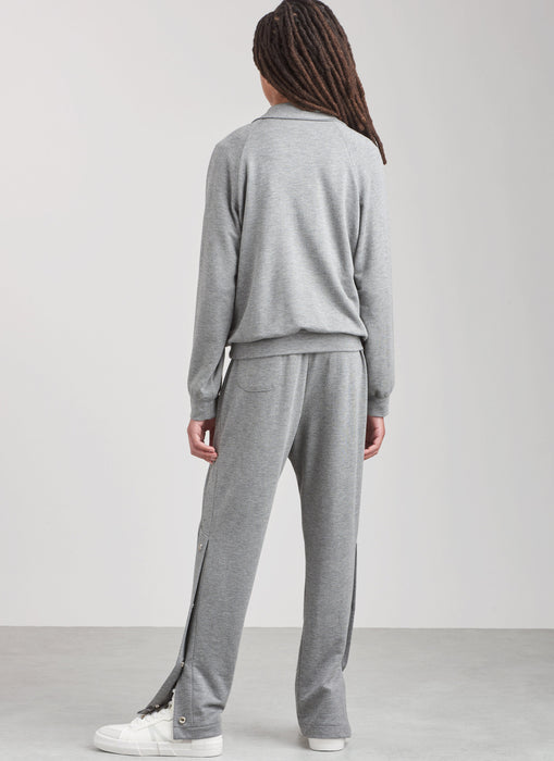 Jacket has raglan sleeves with high stand collar and front zipper opening. Pull-on pants have side panels and split leg below the knee with snap details. Jacket and pants include zippered pockets.
