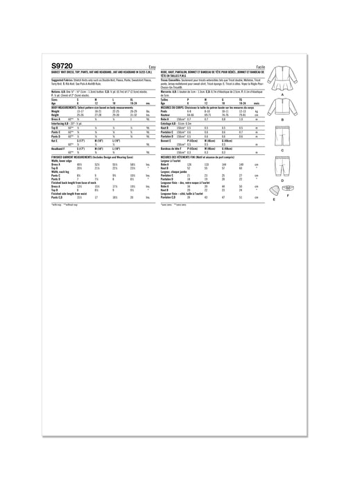 S9720 Babies' Knit Dress, Top, Pants, Hat and Headband in Sizes S-M-L