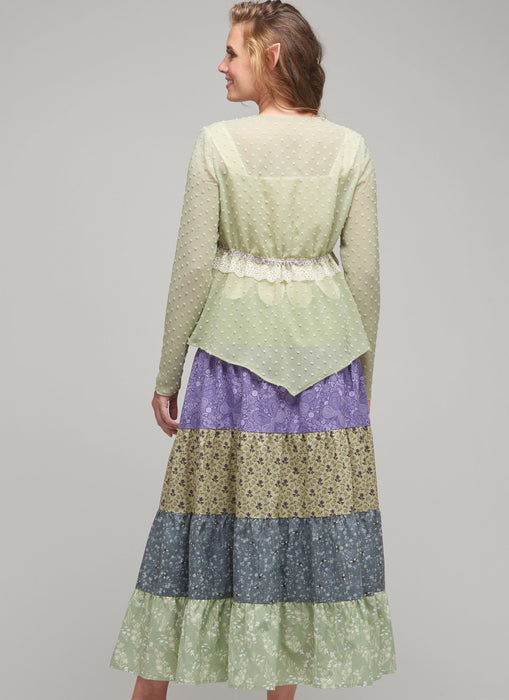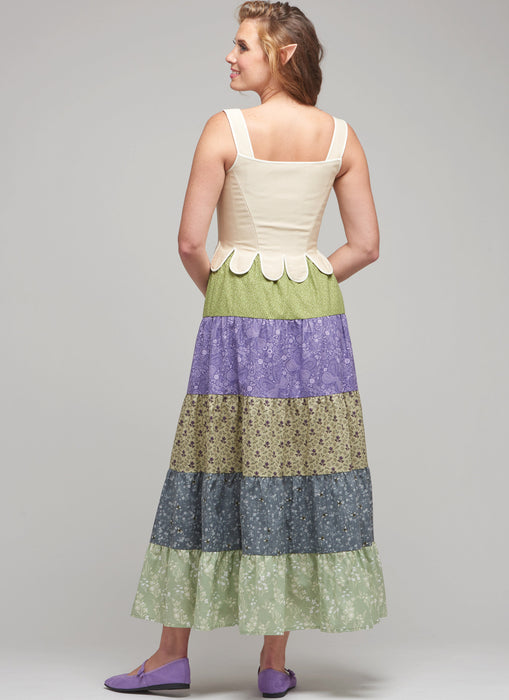 Layered fairycore looks begin with a lined, boned corset featuring front and shoulder strap lacing, scalloped hem and bias tape finishing. Peasant tops with elasticized necks and short puffed or flowing two-piece sleeves can be worn on or off the shoulders. Flowing V-neck top has long sleeves, pointed hem, ties that close with ribbon and lace trims. Pull-on skirts are cut crosswise and have elastic waists and three or five tiers for a variety of lengths. See envelope for more information.