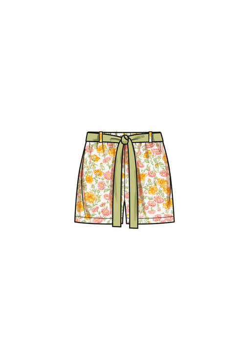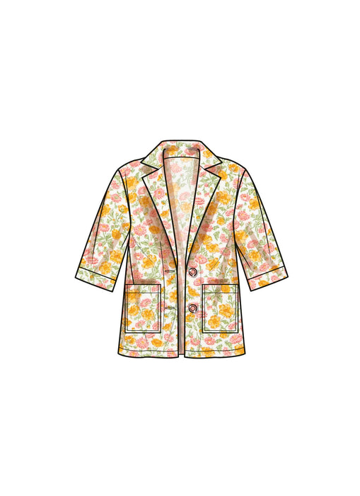 These versatile wardrobe pieces are for children sizes 3 to 6 and girls sizes 7 to 14. Jacket has front button closure, notched collar, three-quarter sleeves with cuffs, and patch pockets. Pants and shorts have waistband, side seam pockets and a tie belt.