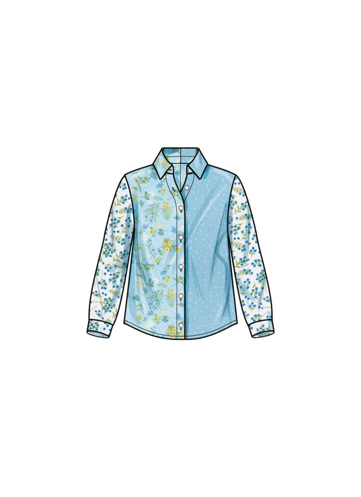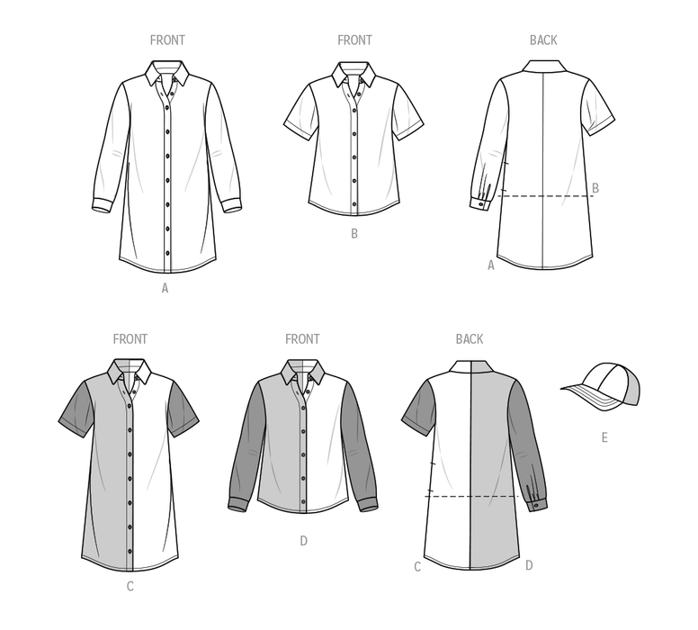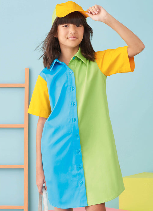 These pretty shirtdresses and shirts in Girls sizes 7 to 14 include short and long sleeves options, button-front closures and contrasting fabrics. Pattern comes with matching baseball cap.