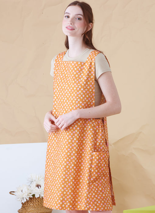 Easy, full-coverage tabard aprons have A-line knee length skirts. Wrap apron has low armholes, V-neck and self fabric ties. Pullover styles have open sides and patch pockets. Scoop neck apron has button trim and partially elasticized waist. Square neck apron has fully elasticized raised waist. See envelope for more information.