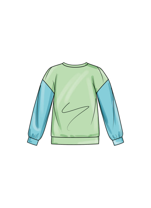 Create these easy-to-sew Girls' and Boys sweatshirts and shorts for sizes 7-14. Pattern includes long and short sleeve sweatshirts and contrast shorts with elastic at waist.