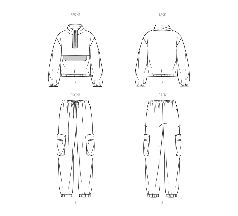 Front half zip sweatshirt has dropped shoulders, long elasticized sleeves, elastic cord at the waist and front pocket with contrast flap. Pull-on track pants have tie cord and elastic at waist and hem plus two cargo pockets with zipper.