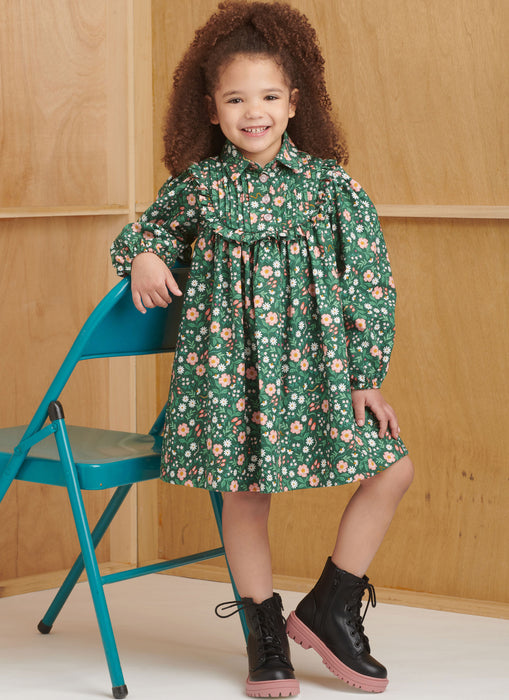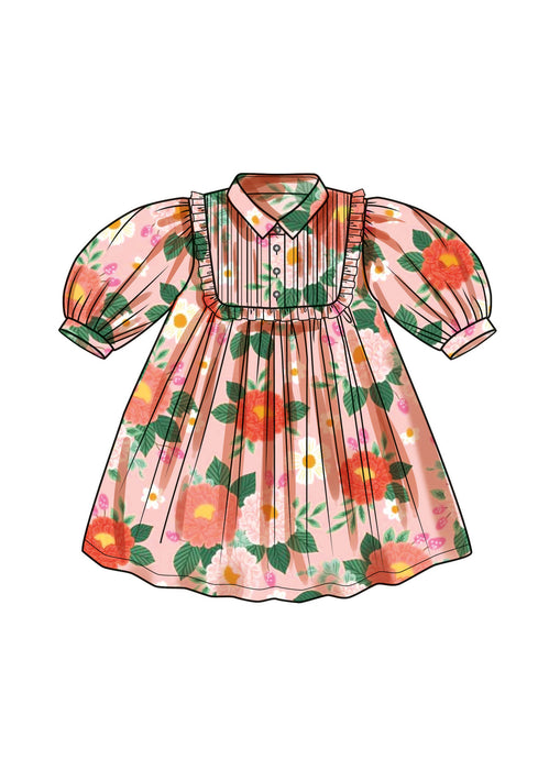 Easy to sew children’s dress has front and back bib, button front placket, gathered ruffle detail, and two collar options with three sleeve variations. Views A and B have pleated bib. View C has contrast bib, placket and band collar.
