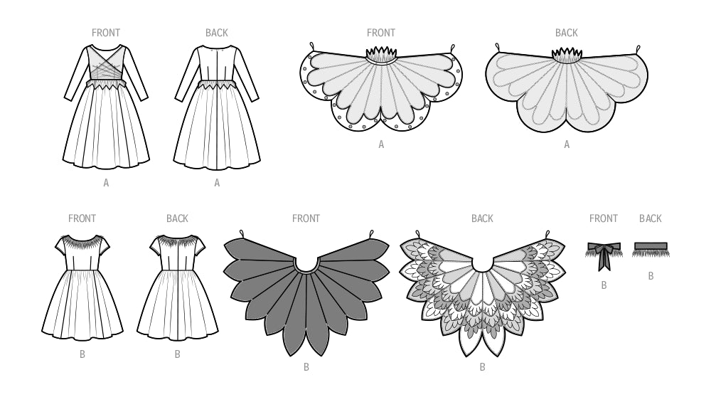 Butterfly and blue bird costumes have pretty dresses with fitted bodices, back zip closures and gathered skirts in mid calf or knee lengths. Add on wings with elastic finger loops attach at back neck with snaps and hooks. Butterfly has sheer bodice overlays, zigzag peplum and collar and sequin trim. Blue bird has fabric feathers, tie belt and feather fringe and sequin trims. Butterfly headband and blue bird mask not included. See envelope for more information.