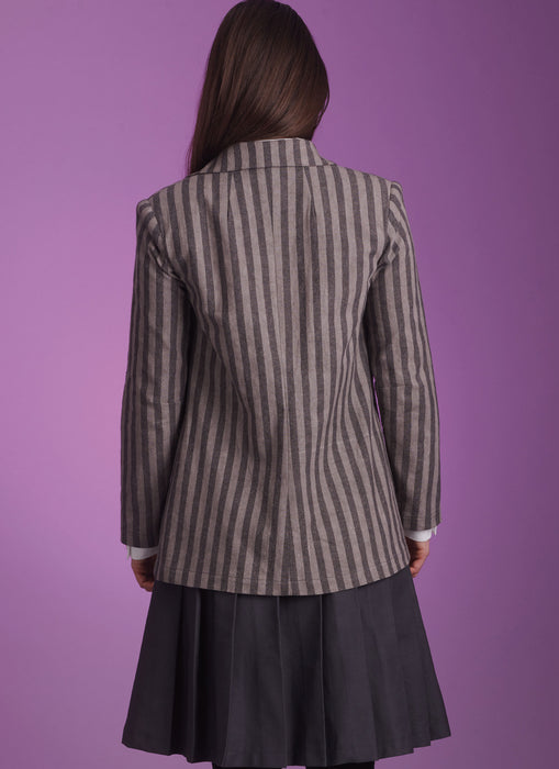 Semi-fitted, unlined double-breasted jacket in two lengths with shoulder pads. View B has pockets. Fitted top has mock front button band, collar and collar band, button cuff long sleeves and narrow hem. Pleated skirt with waistband and side zipper in two lengths is cut on crosswise grain.