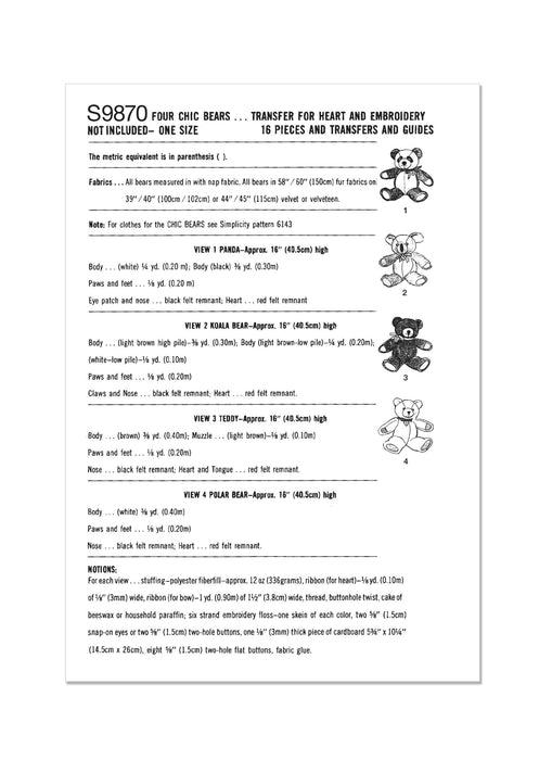 Vintage Simplicity 1980's plush bear sewing pattern. Four chic bears including panda, koala, teddy and polar bear. Pattern includes guides for embroidery in lieu of transfers. Authentic vintage reproduction.