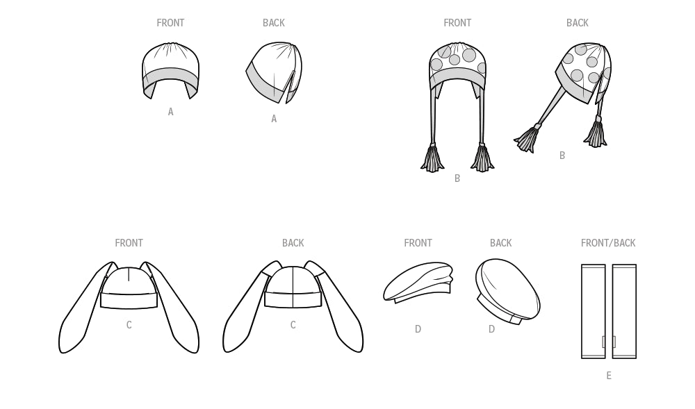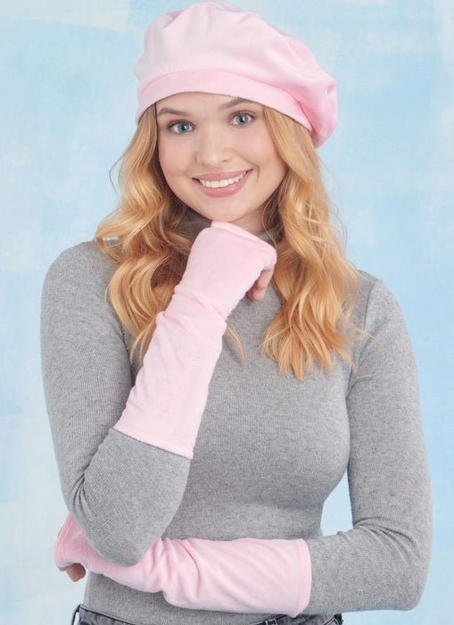 Beanie-style hats with contrast bands and gathered crowns have back slits to hug the neck for a comfy fit. Mushroom-inspired hat has dot appliques and matching side tasseled ties. Hat with floppy bunny ears has snug fit and band folded up to form cuff. Knit beret has narrow band and can be embellished with charms. Arm warmers have thumb holes. See envelope for more information.
