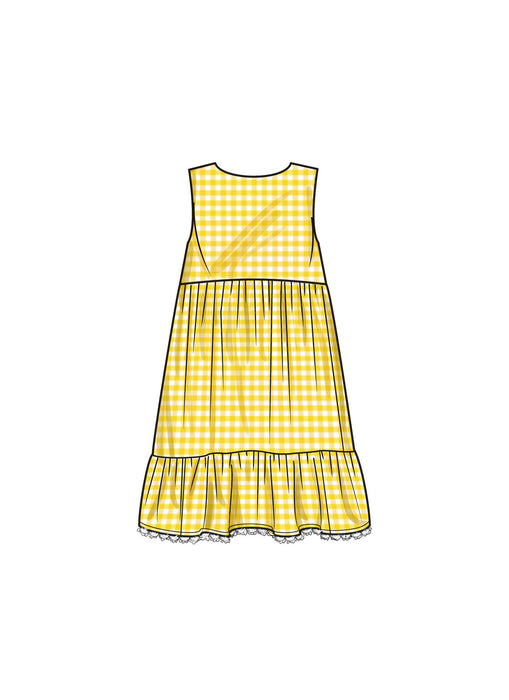 Relaxed fit tiered dress for children and girls sized 3 to 14 has lace trim, invisible zipper closure and sleeve variations. Views A and B have shoulder cutout with bow detail. View C dress has long puffed and gathered sleeves. View D is a sleeveless dress.