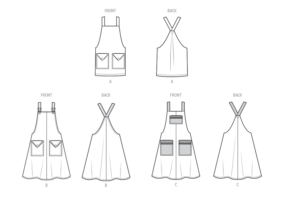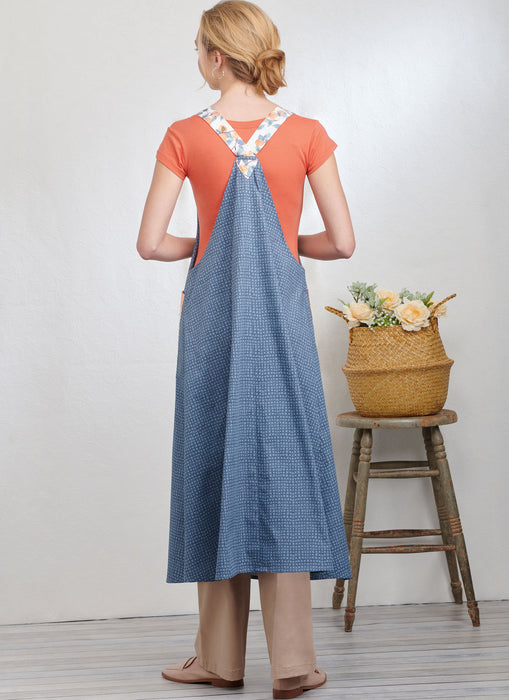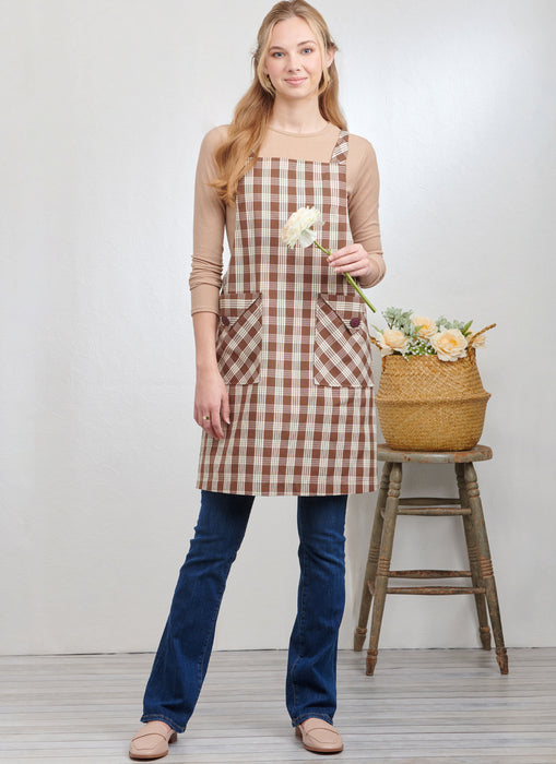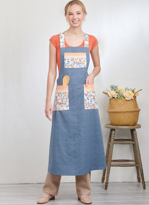 Easy to sew pullover aprons have patch pockets, shoulder straps with overalls-inspired back and triangular patch accent. View A above knee length straight apron has pockets with mock flap styling and button trim. Views B and C flared aprons fall to mid-calf length; design options include overall buckle closure and pockets with mock flap styling, or contrast straps, contrast pockets with bands and flat lace trim. See envelope for more information.