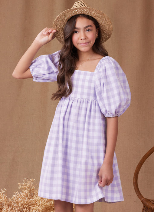 Playful girls' dress with short puff sleeves has open back detailing with tie-up bow, lined bodice, skirt gathers into bodice, side seam pockets and length variations. View B has back invisible zipper closure.