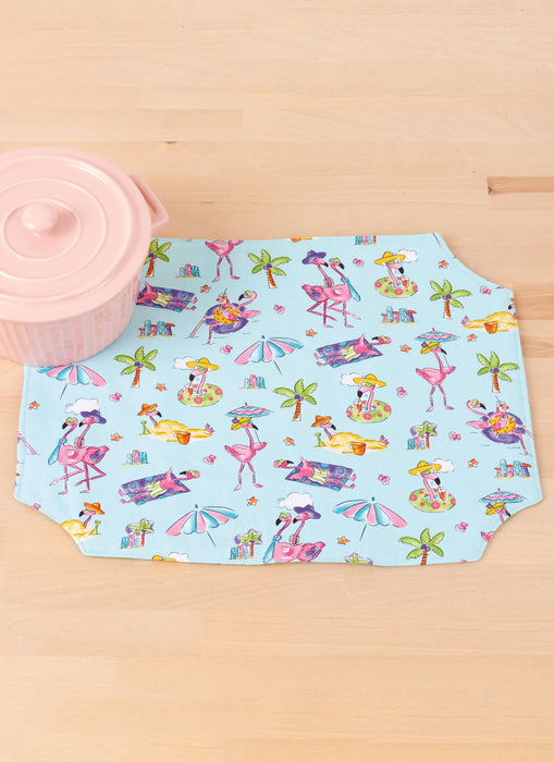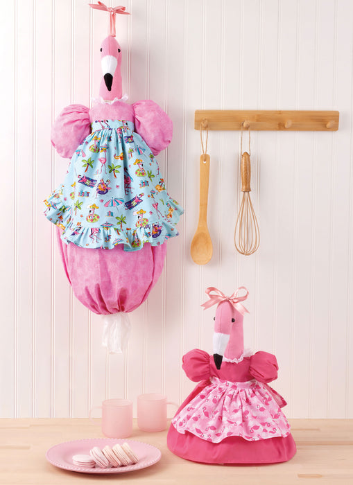 One-size-fits-most aprons have front pockets with contrast bands and contrast tie ends, upper bands and neck straps with hook and loop closures. BBQ style apron has contrast lower band; A-line apron has contrast hem ruffle. Flamingo bag holder and tea cozy have plush body and head, dresses with lightly stuffed and elasticized sleeves and separate aprons. Bag holder has elasticized bottom for easy access. Reversible trivet is large enough for casserole dishes or multiple small items. See envelope for more information.