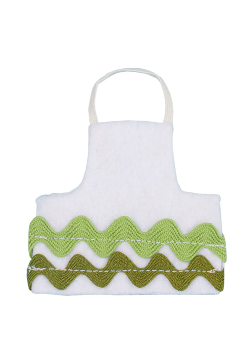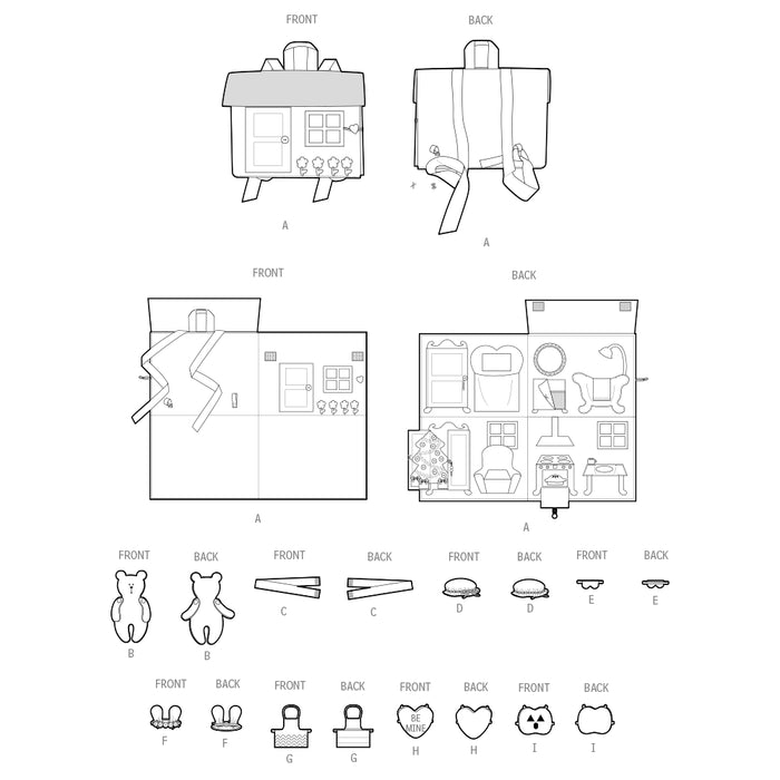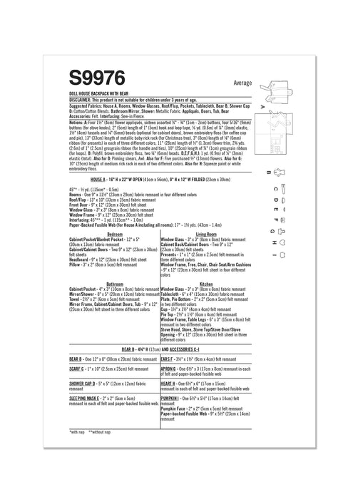 4 ¾” Bear plays in a cotton and felt house. Cabinet and stove doors open and have loop and button closures. Bedroom and bathroom cabinets have pockets for storage. Living room cabinet holds a holiday surprise and a pie is cooking in the oven. Little bear tucks into the bed pocket and tub and slides in nicely behind the table. Fold up the house, hook and loop tape roof onto house then secure with loop and button. Adjust house ribbon straps to fit as a backpack. This product is not suitable for children under 3 years.