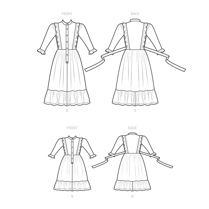 Cottage core prairie dress has front buttoned placket, stand collar, ruffles inserted into front and back princess seams, back tie ends, and three-quarter length puffed tapered sleeves finished with ruffles. Full skirt gathers from waistline seam to mid-calf length with lower ruffle.