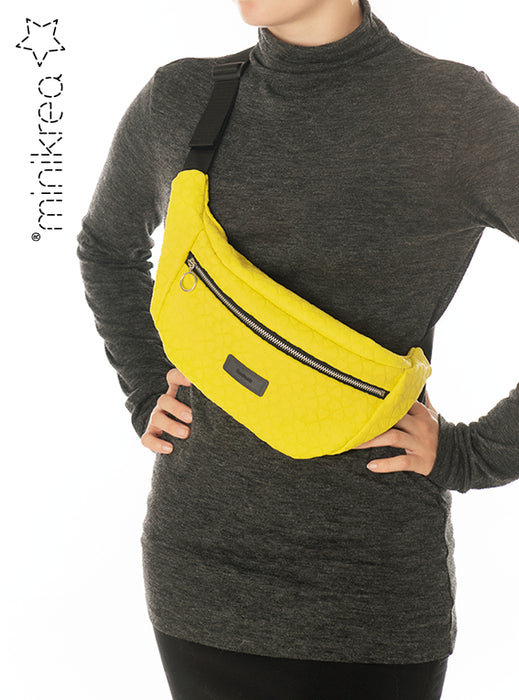 The belt bag is spacious, has a zipper on the front and is worn in the adjustable crossbody shoulder strap.