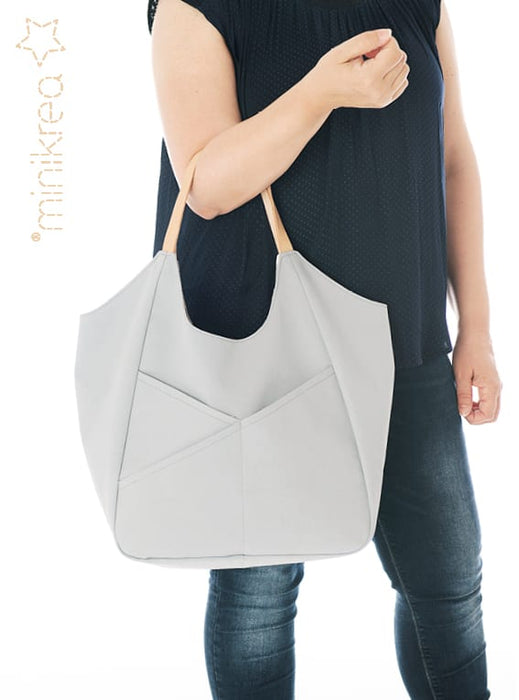 Spacious bag in a minimalistic cut with external slanted pockets.