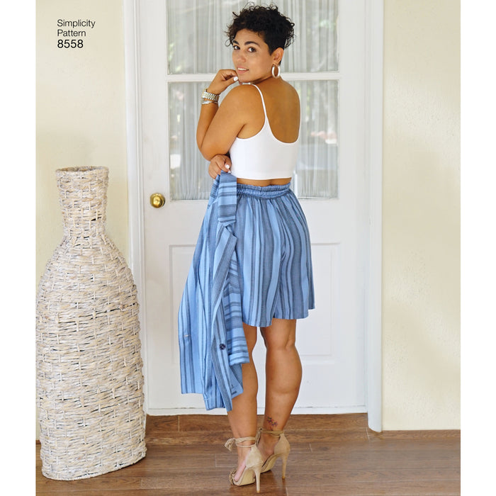 Sew these Misses' sportswear separates designed by Mimi G, featuring pull-on wide-leg pants and shorts with an unlined jacket and knit crop top.