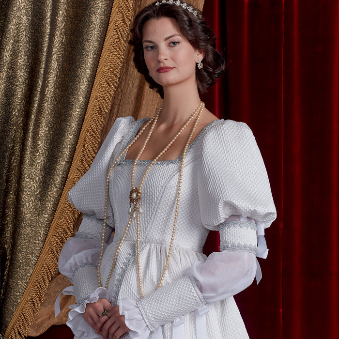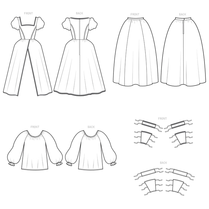 The romance of the Renaissance returns - pattern includes overdress with boned bodice and tie-on sleeves, skirt and blouse. Petticoat not included.