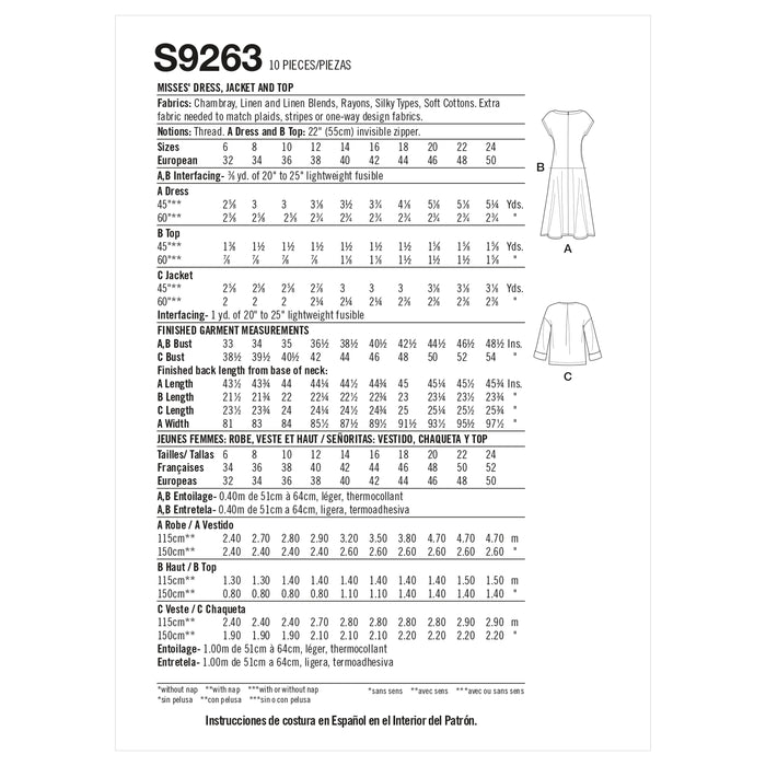 S9263 Misses' Dress, Jacket & Top. Size: 32-50