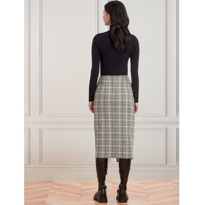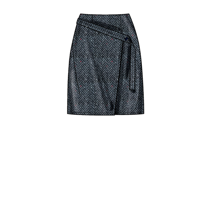 Faux wrap skirt with twist has side seam pockets, front and back darts and center back invisible zipper. Variation for flat wrap front with button closure on extended strap.