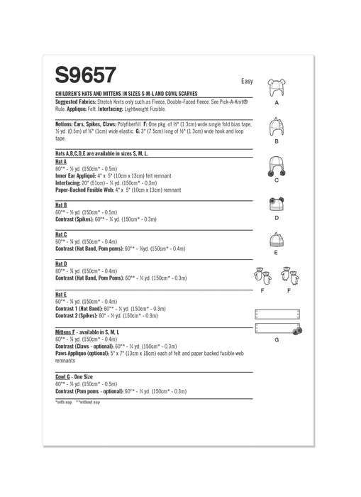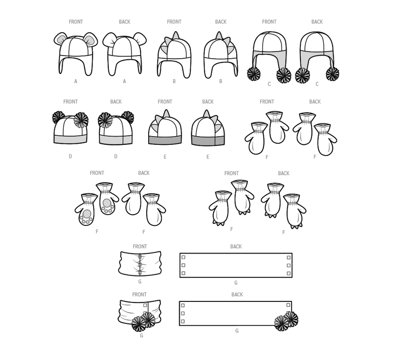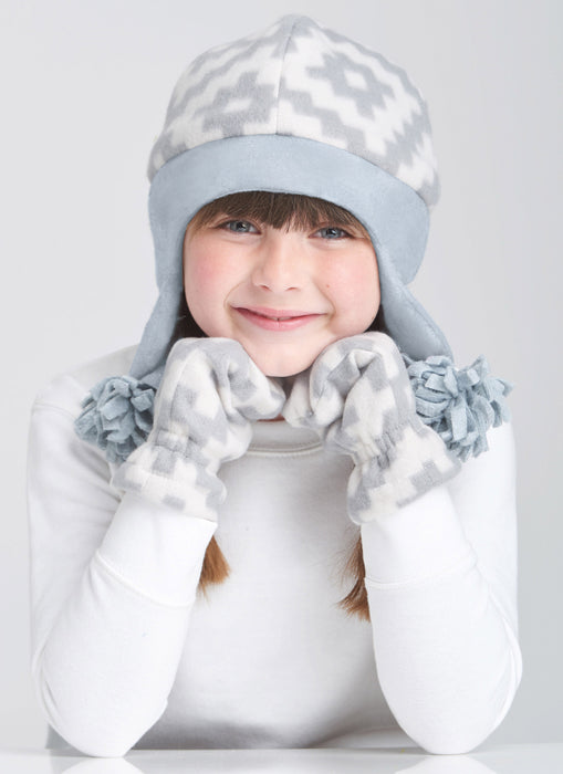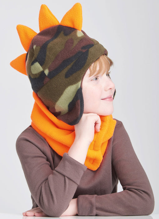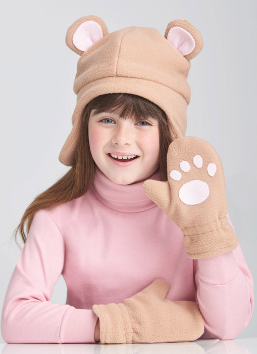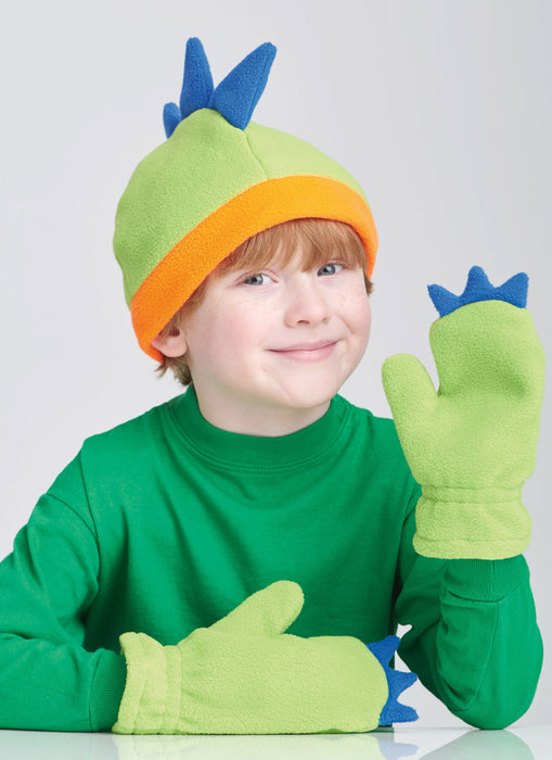 Easy to sew snug hats in sizes S (19"), M (20") and L (21") have bands with or without ear flaps and bear ear, dino spike and pom pom options. Mittens have elastic at wrist and optional paw appliques or claws. Cowl scarf has hook and loop closure and optional pom poms. See envelope for more information.