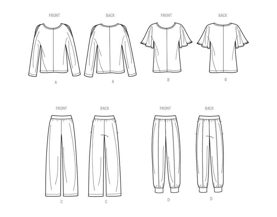 Cold shoulder top A has scoop neckline with long sleeves. Top B is short sleeved. Both pants C and D have knit contrast on waistband. Jogger pants D has ankle cuffs and pin tucks.