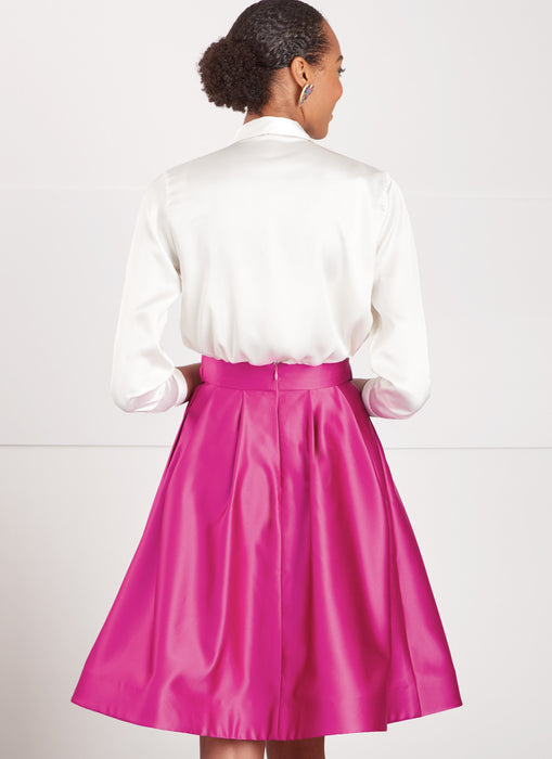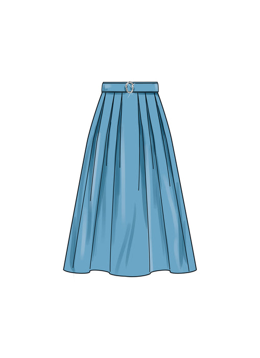 Pleated skirt in three lengths comes with contoured waistband and side seam pockets. Skirt A has belt set in side seams. Skirt C has a pleated self tie.