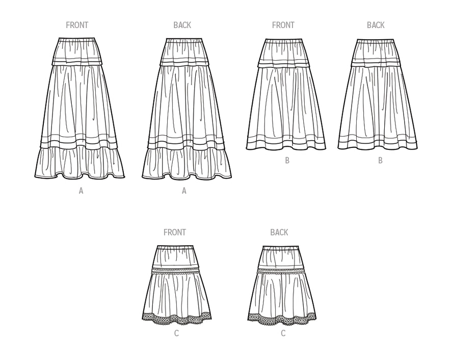 Pull on skirt with tiers and pintucks comes in three lengths: midcalf, knee and mini. View C has purchased lace trim at the hem.