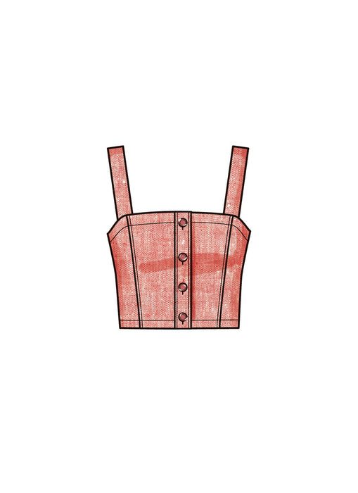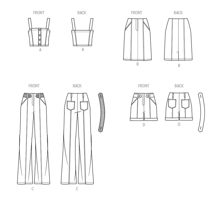 Stylish front button crop top with straps and princess seams at the front and back. Skirt, pants and shorts have center front seams and fly front zipper closure. Pants and shorts include belt with button detail and back patch pockets.