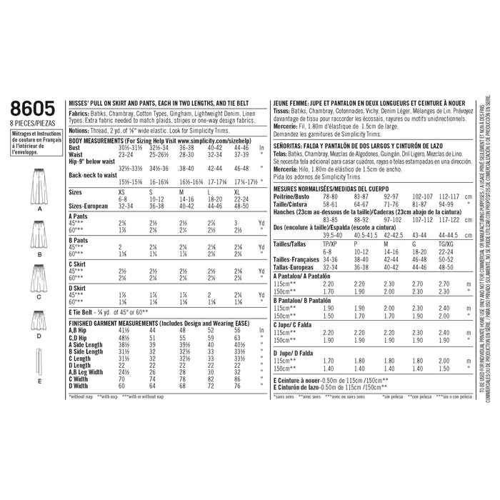 8605 Misses' Pull-On Skirt and Pants. Size: XS-XL (32-50)