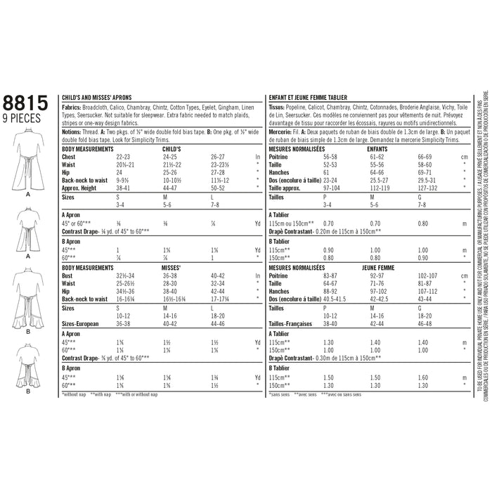 8815 Children's and Misses' Aprons. Size: Kid´s S-L (3-8 y) / Adults S-L (36-46)