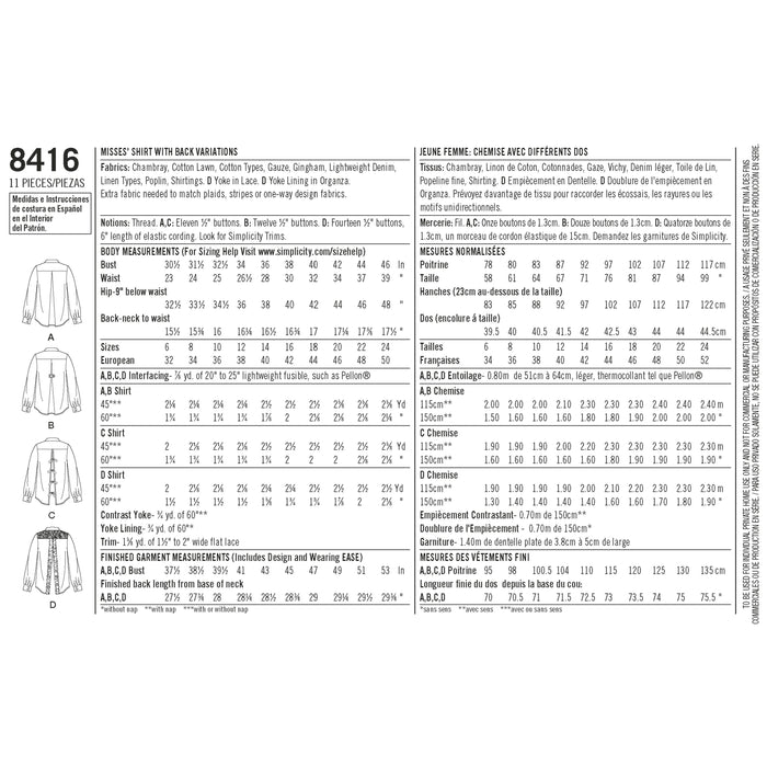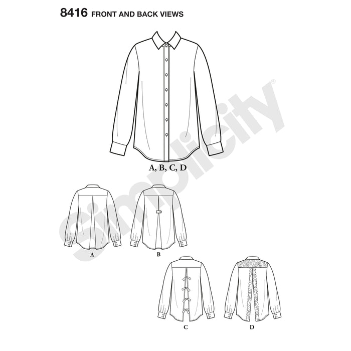 8416 Misses' Shirt with Back Variations. Size: 32-50