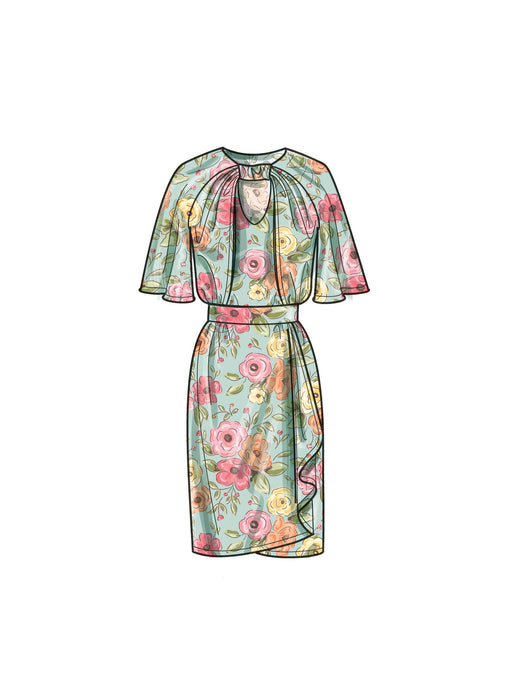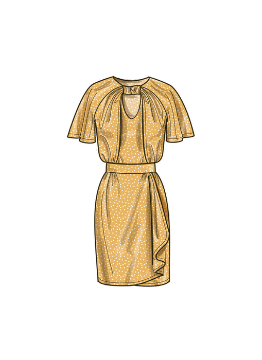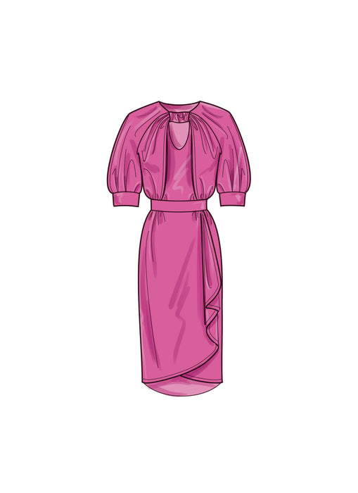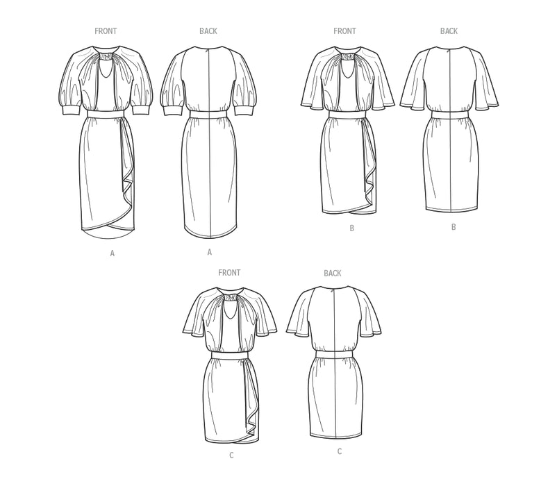 Dress features knotted draped bodice overlay, cutout neckline, waistband at skirt encased into side seam, and back zipper. View A is a long dress with pleated puff sleeves and sleeve bands. Views B and C have flutter sleeves. View C is a mini dress. Sales from this pattern help support American Sewing Guild dedicated to Advancing Sewing as an Art and Life Skill. Learn more at www.asg.org.