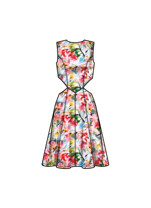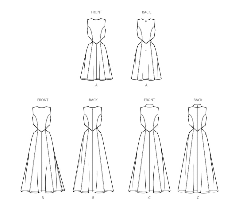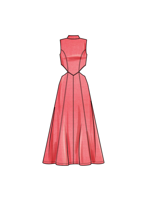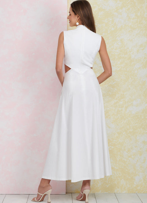 Easy to sew dresses have fitted bodice and A-line shaped skirt with or without side split. Dress features stand neckline or jewel neckline, waist cut outs, side pockets and center back zipper closure.