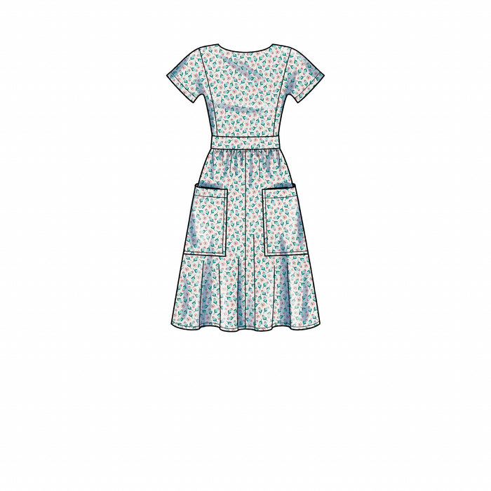 Misses’ dresses with front bodice seaming, fitted at waist. Back button closure with back open bodice or centre back button variations.