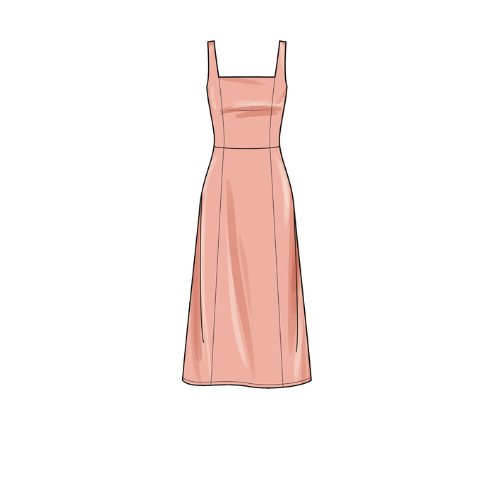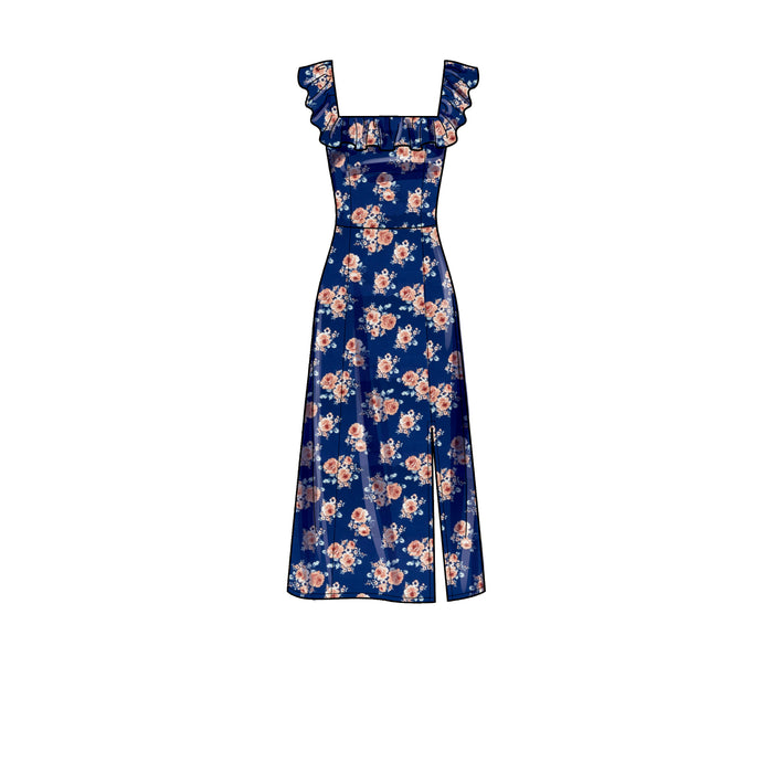 Misses' dresses with or without ruffle neckline; lined bodice; princess seams on bodice and skirt; bra friendly.