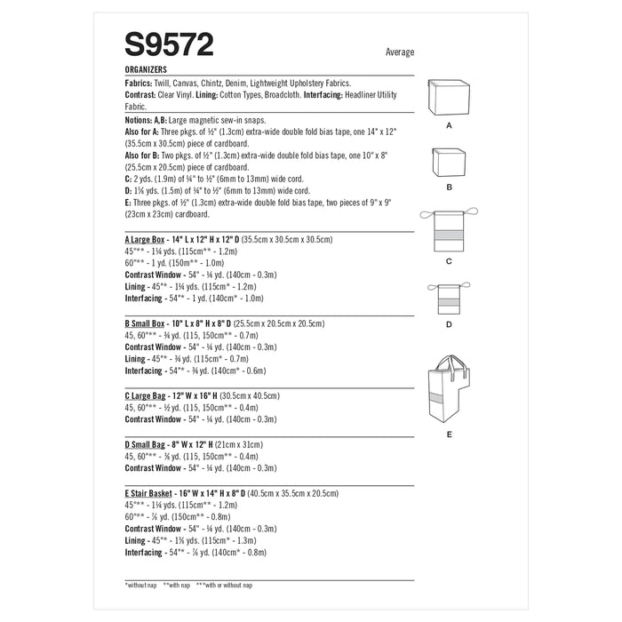 Storage boxes, bags and stair basket have clear vinyl windows to show contents for easy organizing. Lined boxes in two sizes have snap-closed lids, and stair basket has lightly padded construction, bias binding and covered cardboard bottoms. Drawstring bags in two sizes have windows on both sides. See envelope for more information.