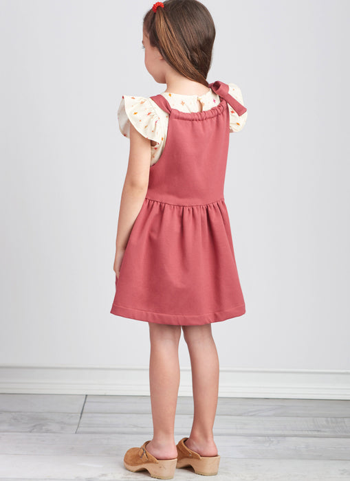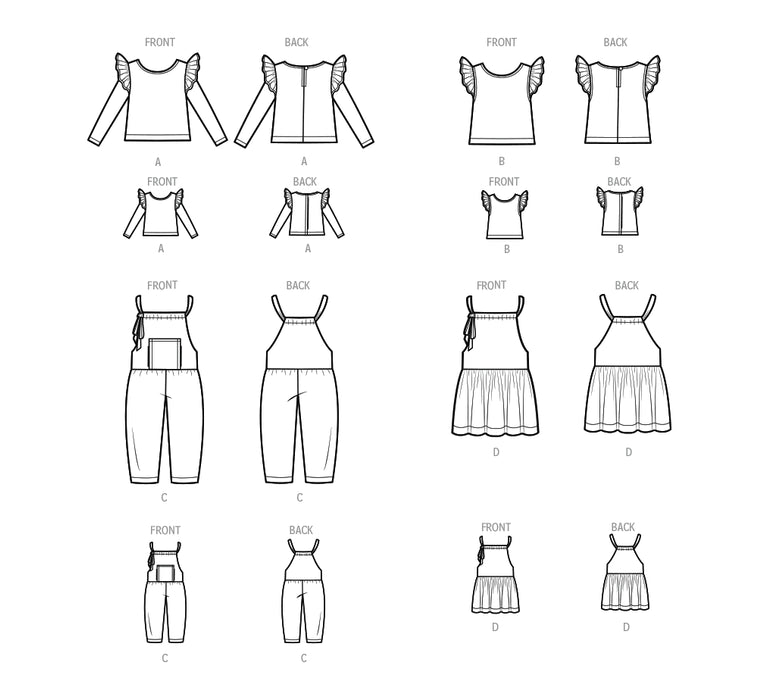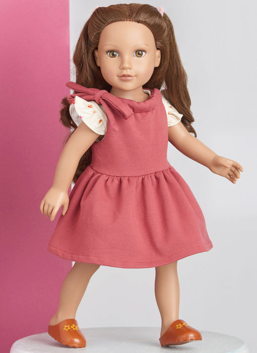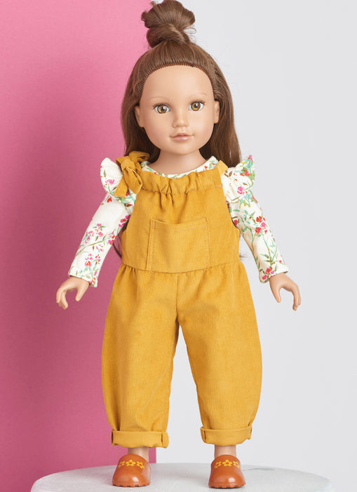 Pullover knit tops have back button and loop closure and shoulder ruffles, and can be sleeveless or made with long sleeves. Step-in overalls and jumper have anchored drawstring forming straps and side bow, relaxed fit pants, and gathered knee length skirt. Matching doll clothes included. See envelope for more information.